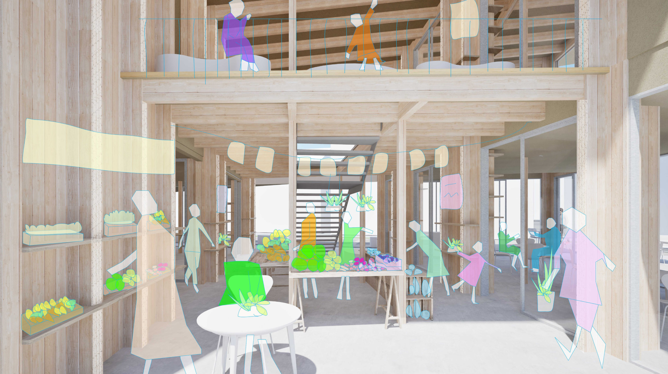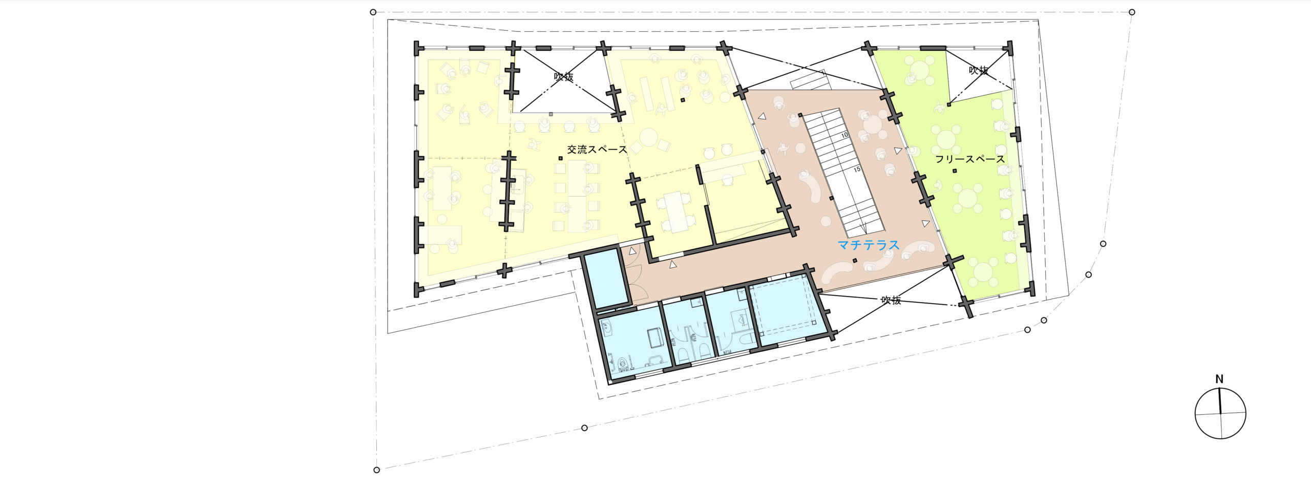 交流スペースとフリースペースを東西に分け、管理・運営のしやすい構成。両者の中間に位置する「マチテラス」は、外部から誰もが自由に直接アクセスできる開かれた空間。メイン空間としての利用はもちろん、東西それぞれの空間のバッファーや延長としても柔軟に活用される。