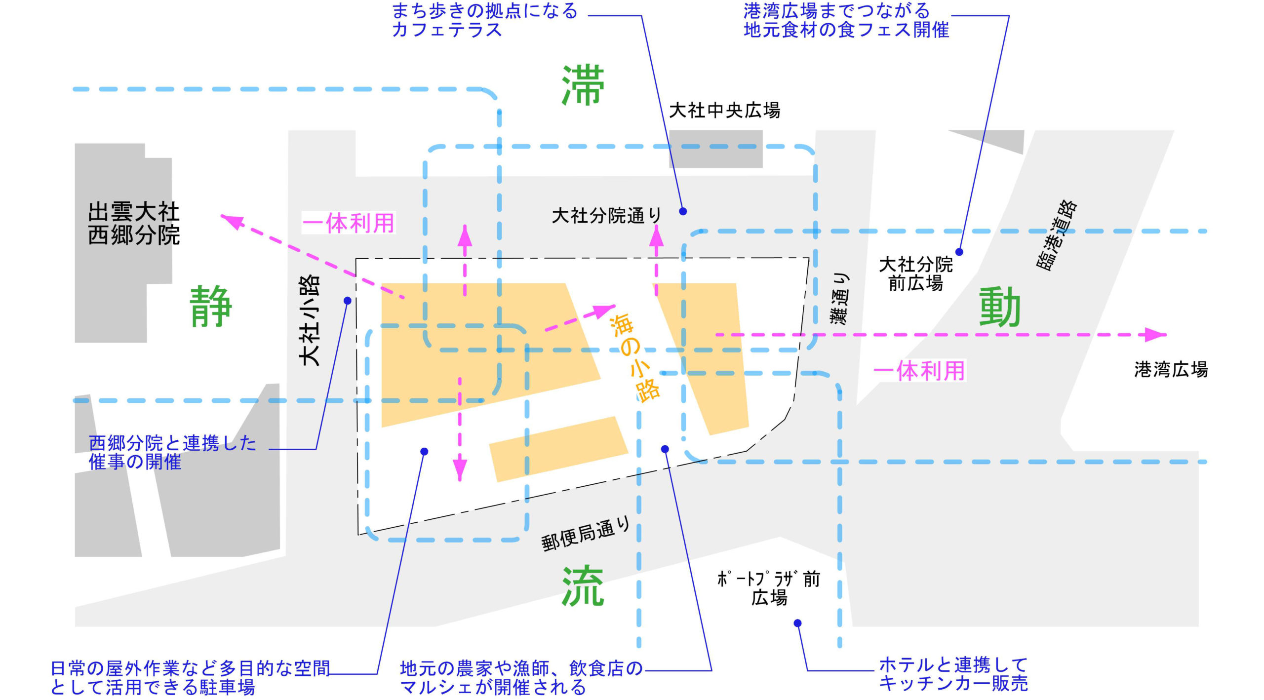 四方それぞれの特性を活かし、静・動・滞・流の多様な活動が、まちの顔となる。