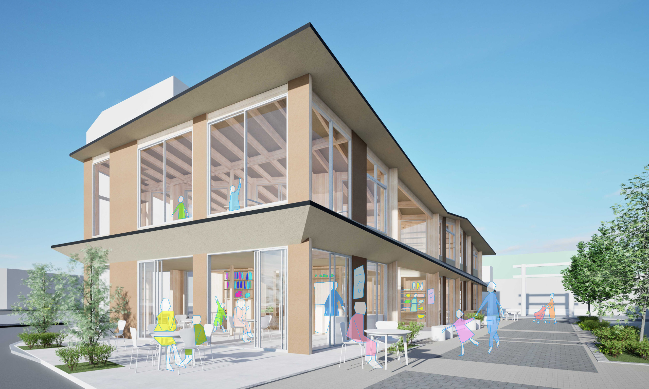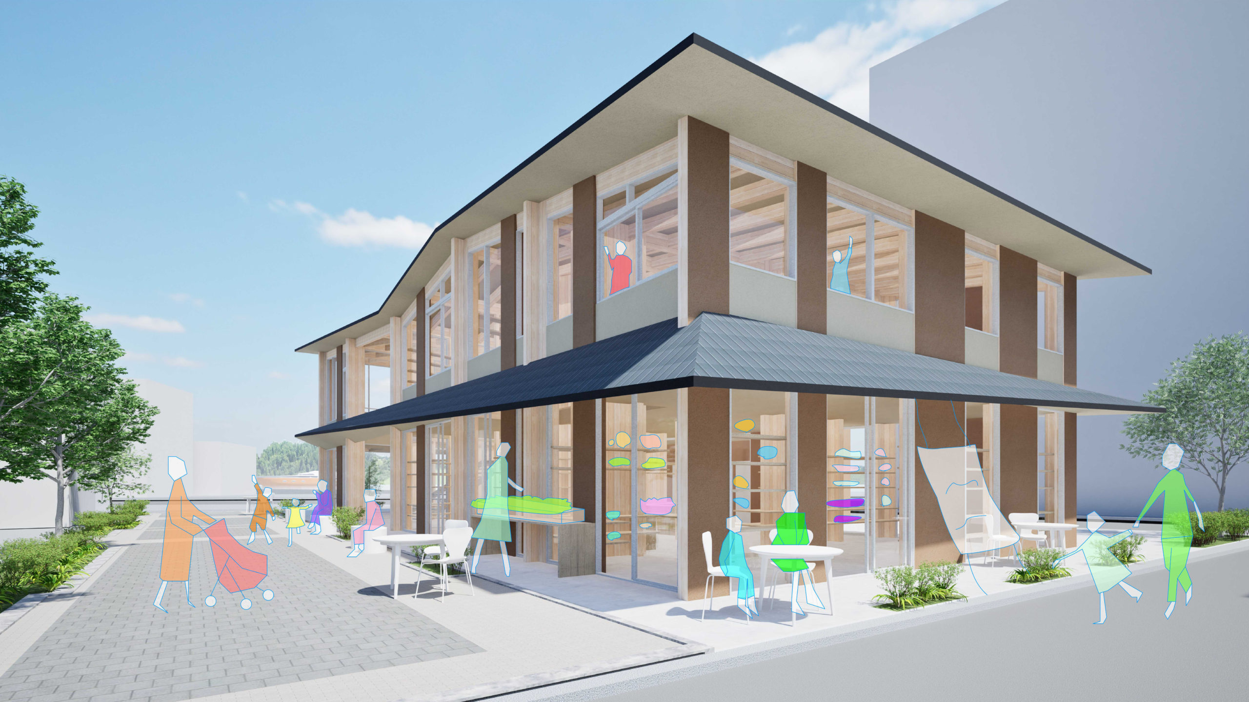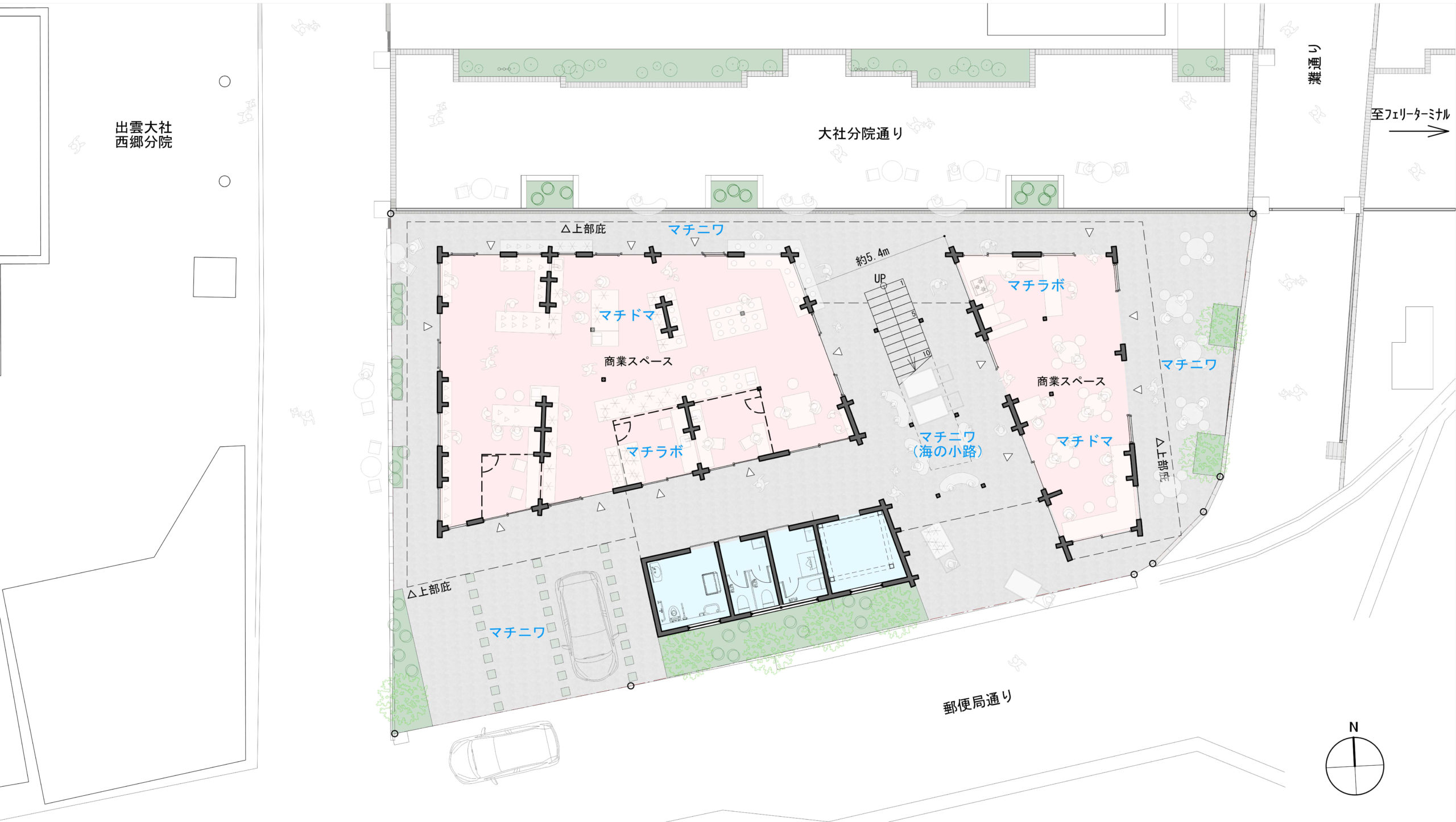 商業施設を東西に分棟することで、多様な運営形態や空間の使い分けが可能に。東棟は半屋外空間として開放的に活用し、西棟は空調の効いた屋内空間として快適性を確保。営業時間の設定も柔軟で、「マチドマ」「マチラボ」「マチニワ」といった場がまちに賑わいをもたらす。
